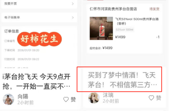 目前,1499元飞天茅台通过i茅台的发售,也让不少成功下单的用户过上了一个“欢喜”的元旦假期。《BUG》栏目注意到,在小红书等平台上,已有不少成功下单1499元飞天茅台的用户晒单庆祝,并配文道:“买到了梦中情酒‘飞天茅台’”。